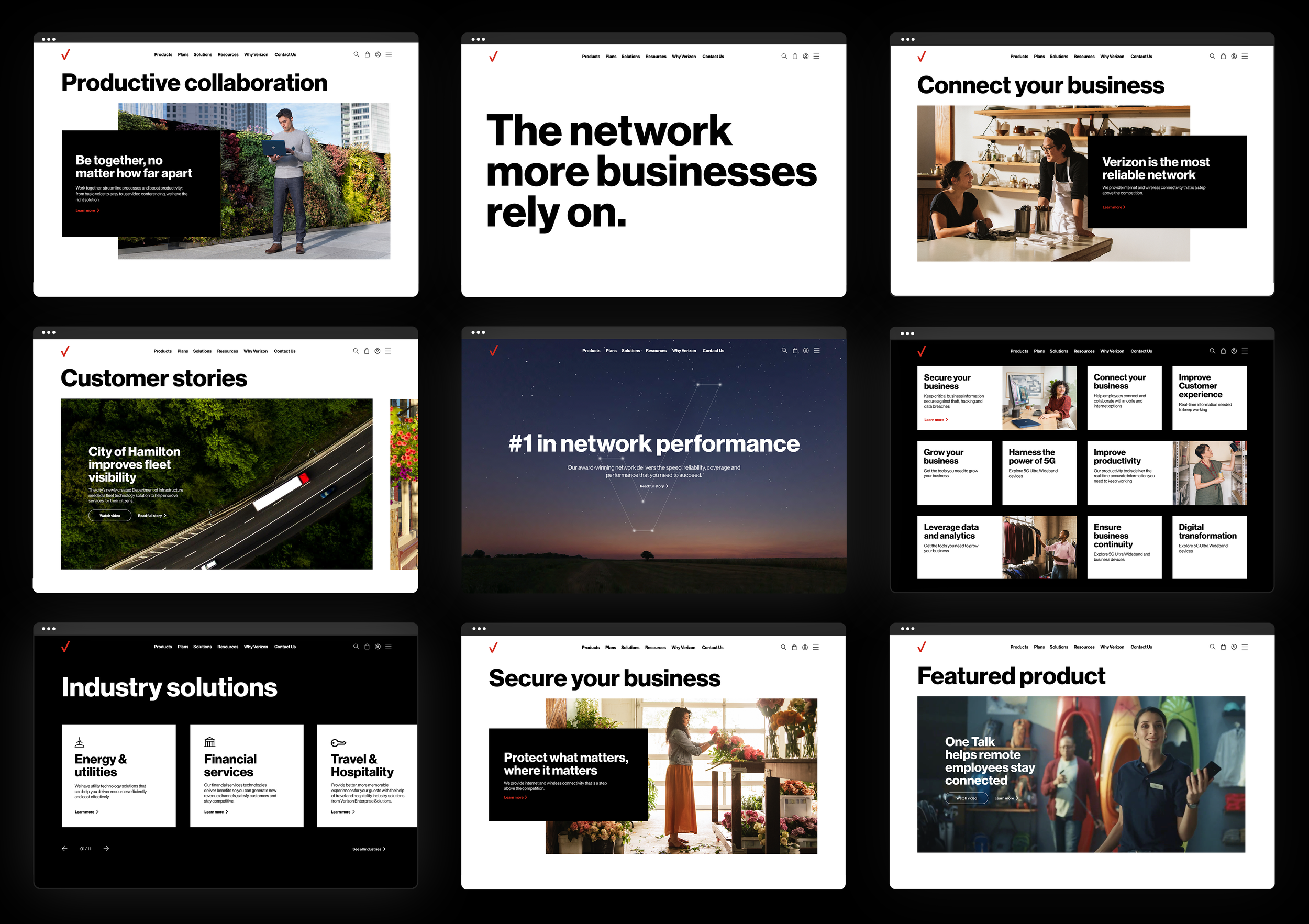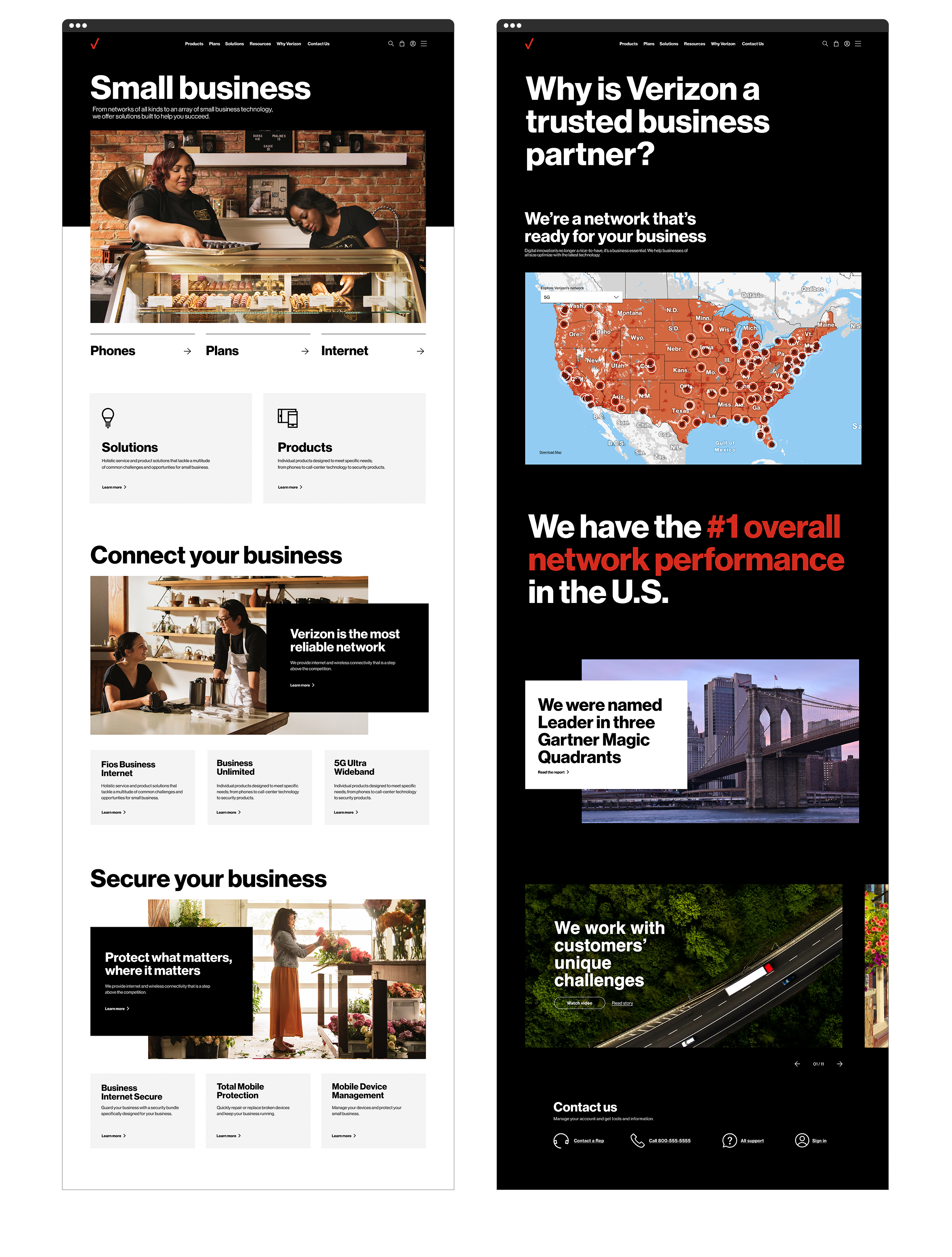 Thousands of businesses rely on Verizon’s network for its unmatched reliability, flexibility, and security, which makes it a trusted partner in driving technological innovation across industries. To further strengthen these business customer connections and help Verizon stand out from competitors, I worked closely with Verizon’s internal Brand team to lead the redesign of the Verizon Business website. My role involved rethinking the user experience and ensuring the new design communicated Verizon’s deep understanding of enterprise needs, from small startups to large corporations. We focused on creating a streamlined, user-friendly interface that clearly highlighted Verizon’s robust suite of business products and solutions, including their flexible communication tools, secure network infrastructure, and advanced IoT capabilities. Through dynamic visuals, improved navigation, and targeted messaging, we enhanced the site’s ability to engage visitors and guide them to the solutions that best fit their needs, while reinforcing Verizon’s position as a leader in business technology.
